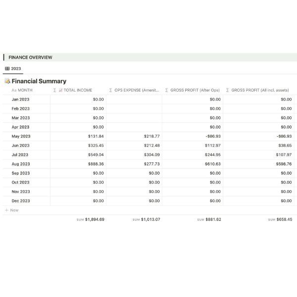- Financial Tracking: Review monthly financial summaries, including operational expenses, asset purchases, and profit calculations.